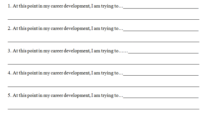 Part 1. Consider the activities you are currently engaging in to help you build a successful career. We might call these types of activities “career development strivings.” Be as honest and as objective as possible; do not simply give socially desirable strivings or strivings you think you “ought” to have. Please write down what you currently consider to be the 5 most important career development strivings in your life.