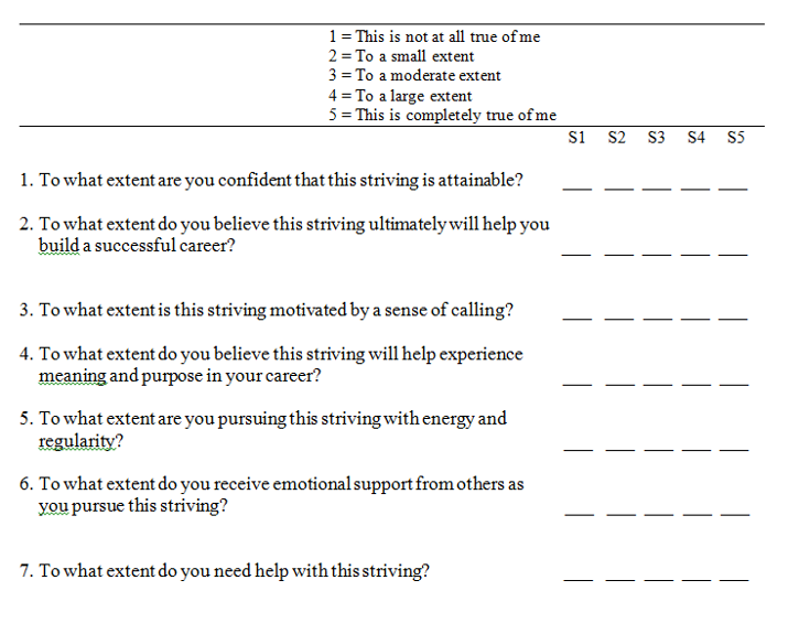 There are two parts to this exercise. The first asks you to identify five things that you are currently striving for in your career. The second asks you to rate each of those “strivings” along seven criteria. Give this a shot, then read on.